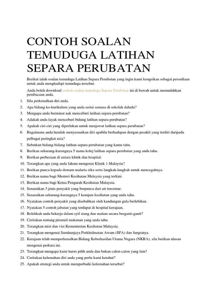 Contoh Soalan Temuduga Latihan Separa Perubatan Pdf